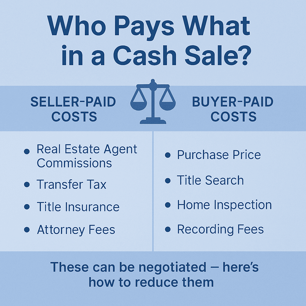 In a typical cash sale, the seller and buyer each cover different parts of the closing costs, but these responsibilities can be adjusted depending on the deal. Knowing who pays what helps you prepare financially and avoid surprises at closing.
